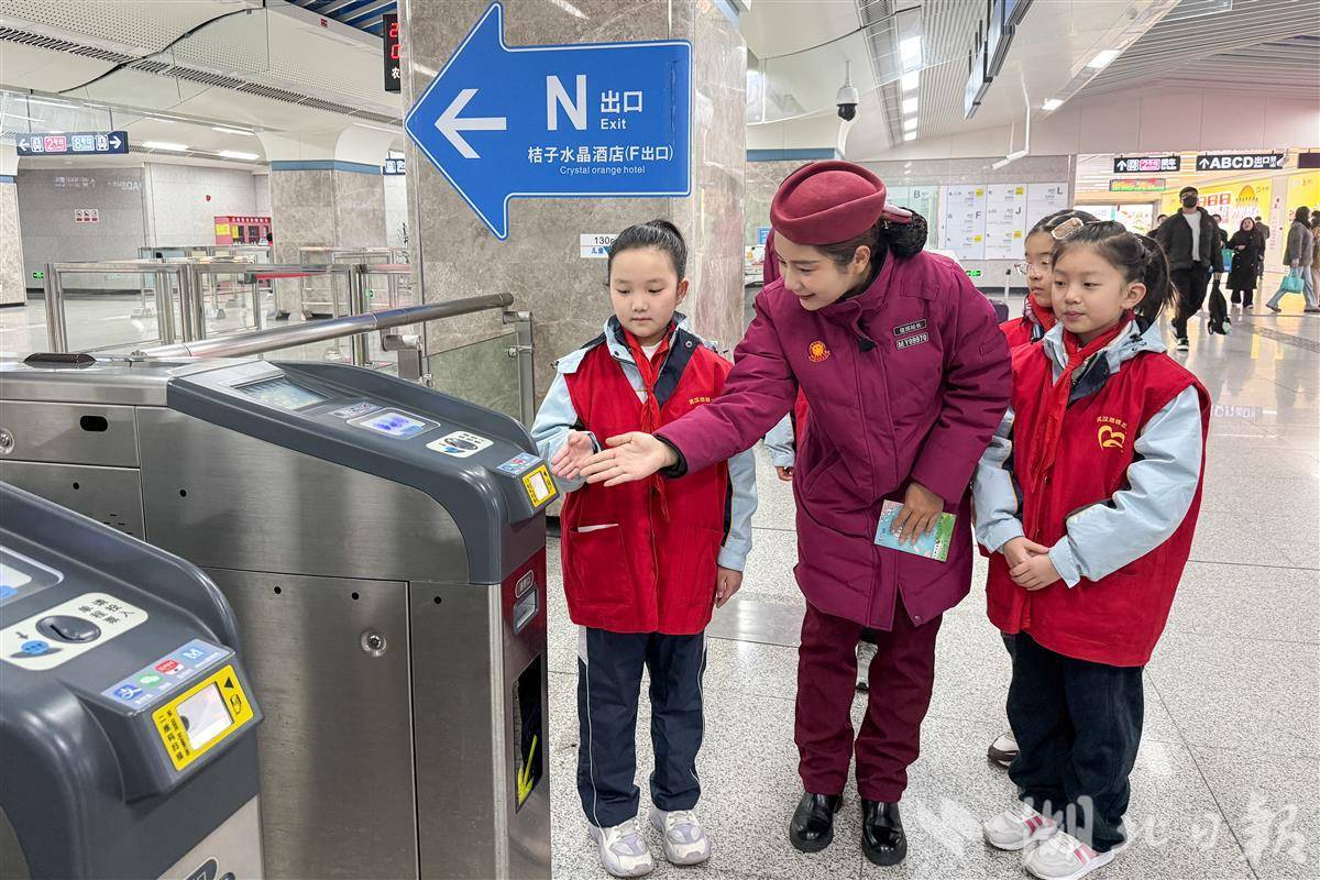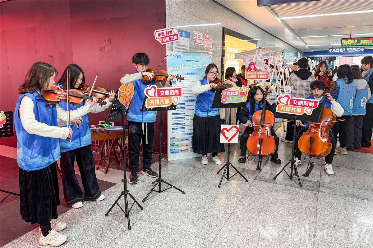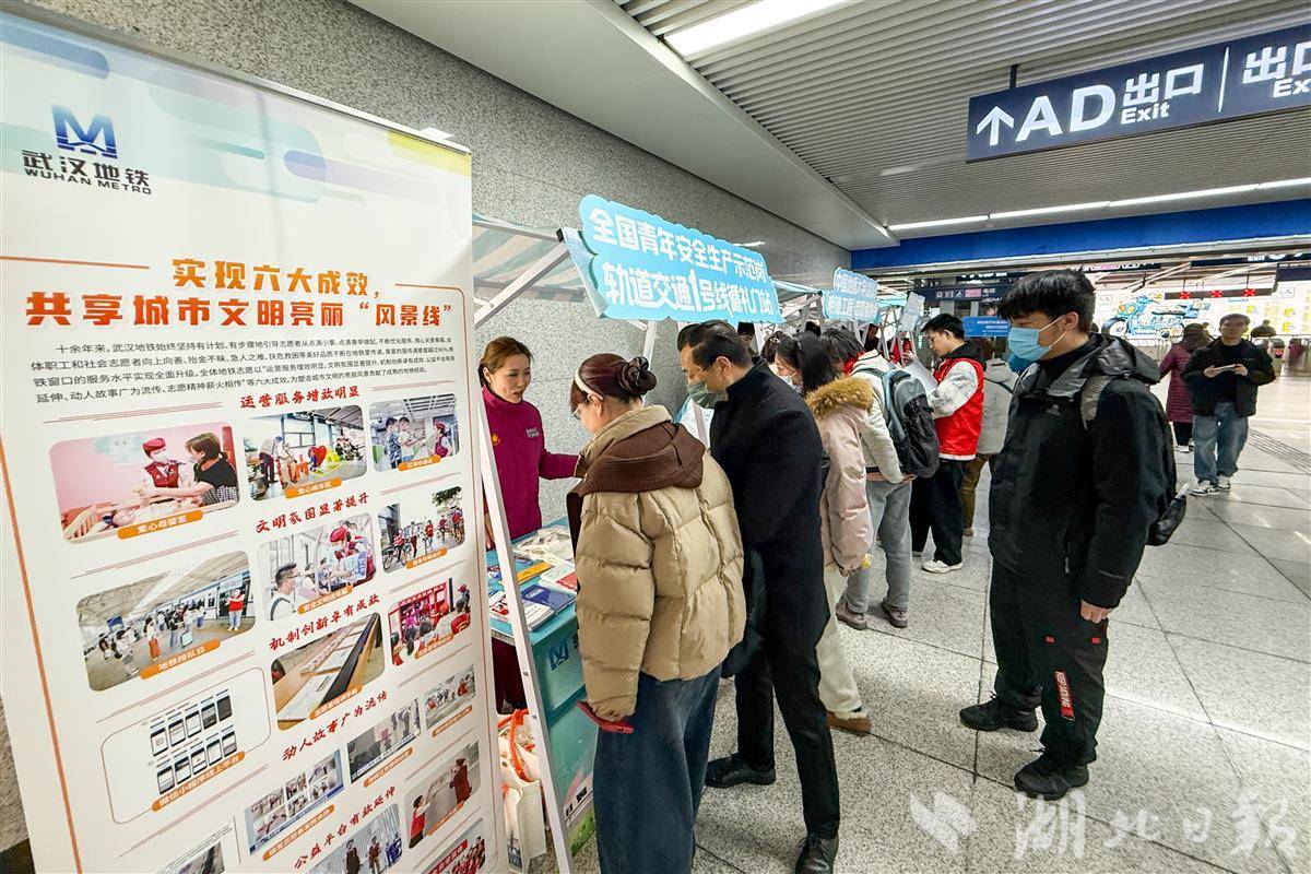 2026年3月5日,第63个“学雷锋纪念日”,武汉地铁“追锋少年”“青锋启航”志愿行活动在街道口站启动。据介绍,此次活动面向全市大中小学生招募志愿者,开展文明引导、秩序维护等服务。中小学生周末可打卡集章获证书;大学生长期参与可获服务证明。现场多支志愿队伍展示特色服务,小学生率先上岗体验。去年活动吸引4万人次参与,服务时长5.6万小时。地铁变身“流动课堂”,青少年以行动传承雷锋精神,展现青春担当。(湖北日报全媒记者 倪娜 通讯员 李丹 产启斗 钱泰吉 摄)