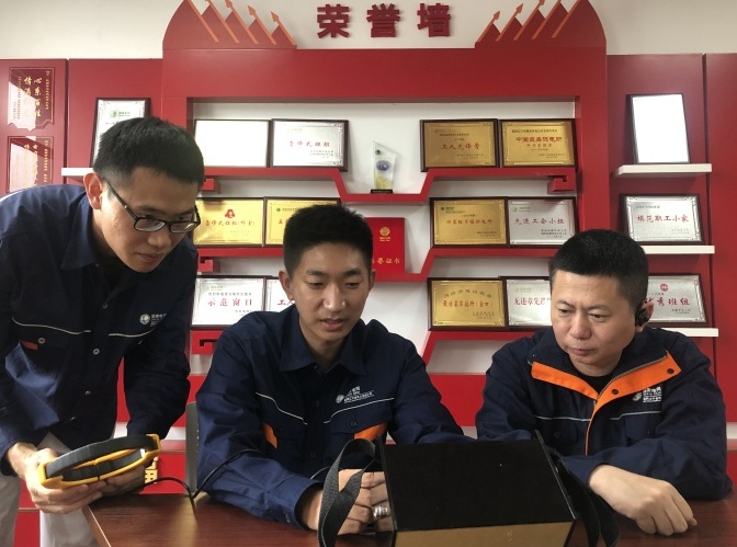刘传波(中)与同事研讨技术创新方案。人民网记者 王斯文摄