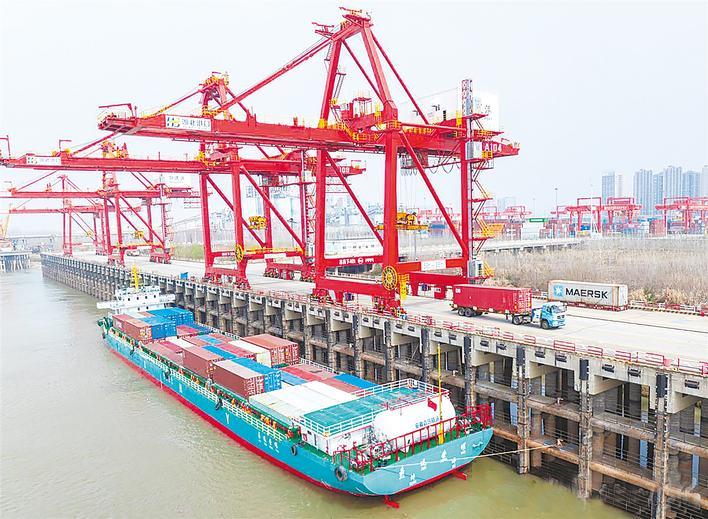 3月5日,来自印尼的“蓝宁19”等巨轮停靠武汉阳逻港,龙门吊长臂舞动,集卡车排队转运,100多标箱的进口硫酸镍以及无纺布、电子元器件等,通过这个全国内河首个铁路装卸自动化码头与集装箱智慧码头,转运至全国各地。