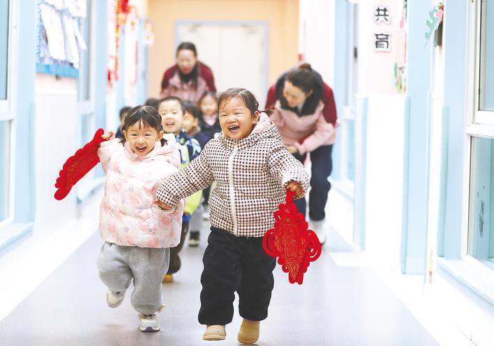 1月5日,荆门市东宝区浏河社区托育中心内,保育员正带着孩子们做互动游戏,教室里笑声阵阵,温馨满溢。(视界网 赵平 欧阳萍 摄)
