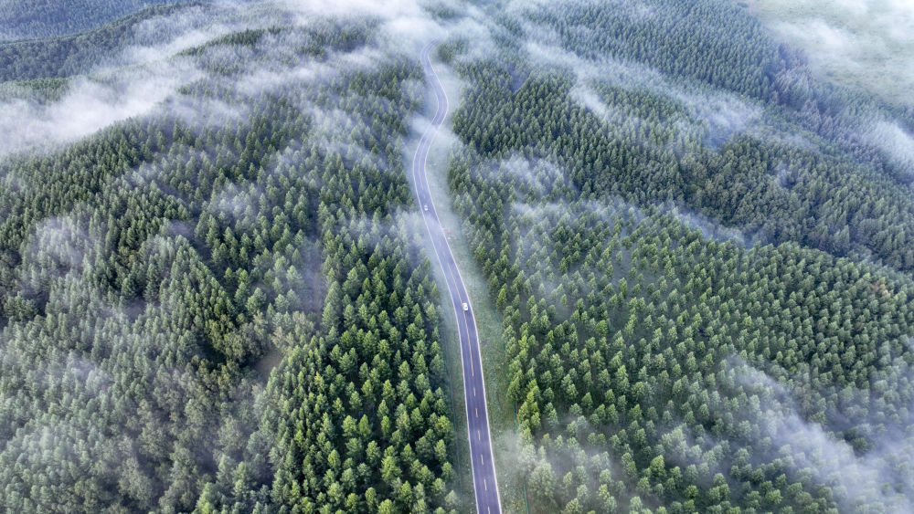 2024年7月26日拍摄的塞罕坝国家级自然保护区景色(无人机照片)。夏日清晨,位于河北省承德市的塞罕坝国家级自然保护区满目青翠,浩瀚林海壮美如画。新华社发(王立群 摄)