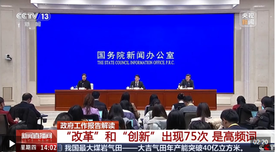 国务院新闻办公室今天举行吹风会,《政府工作报告》起草组负责人、国务院研究室主任沈丹阳从五个方面解读《政府工作报告》。其中,“改革”和“创新”共出现75次,成为今年《报告》的高频词。