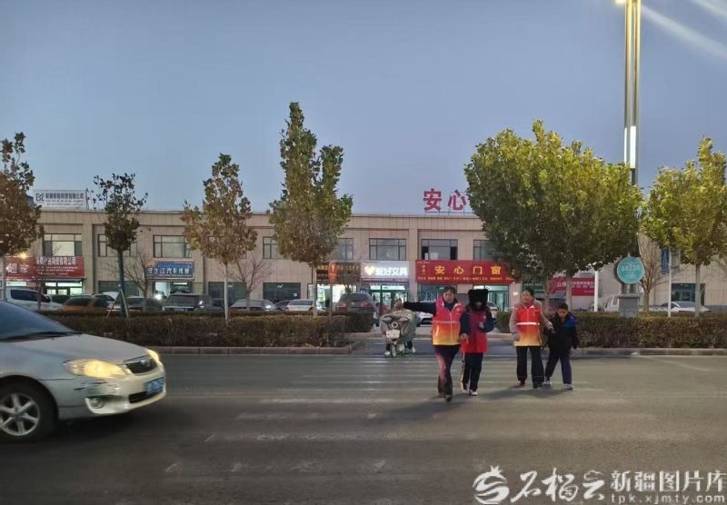 库尔勒市第十小学附近,库尔勒市永安街道康健社区“共享奶奶”志愿服务队帮邻居接孩子。古扎努尔·巴拉提摄