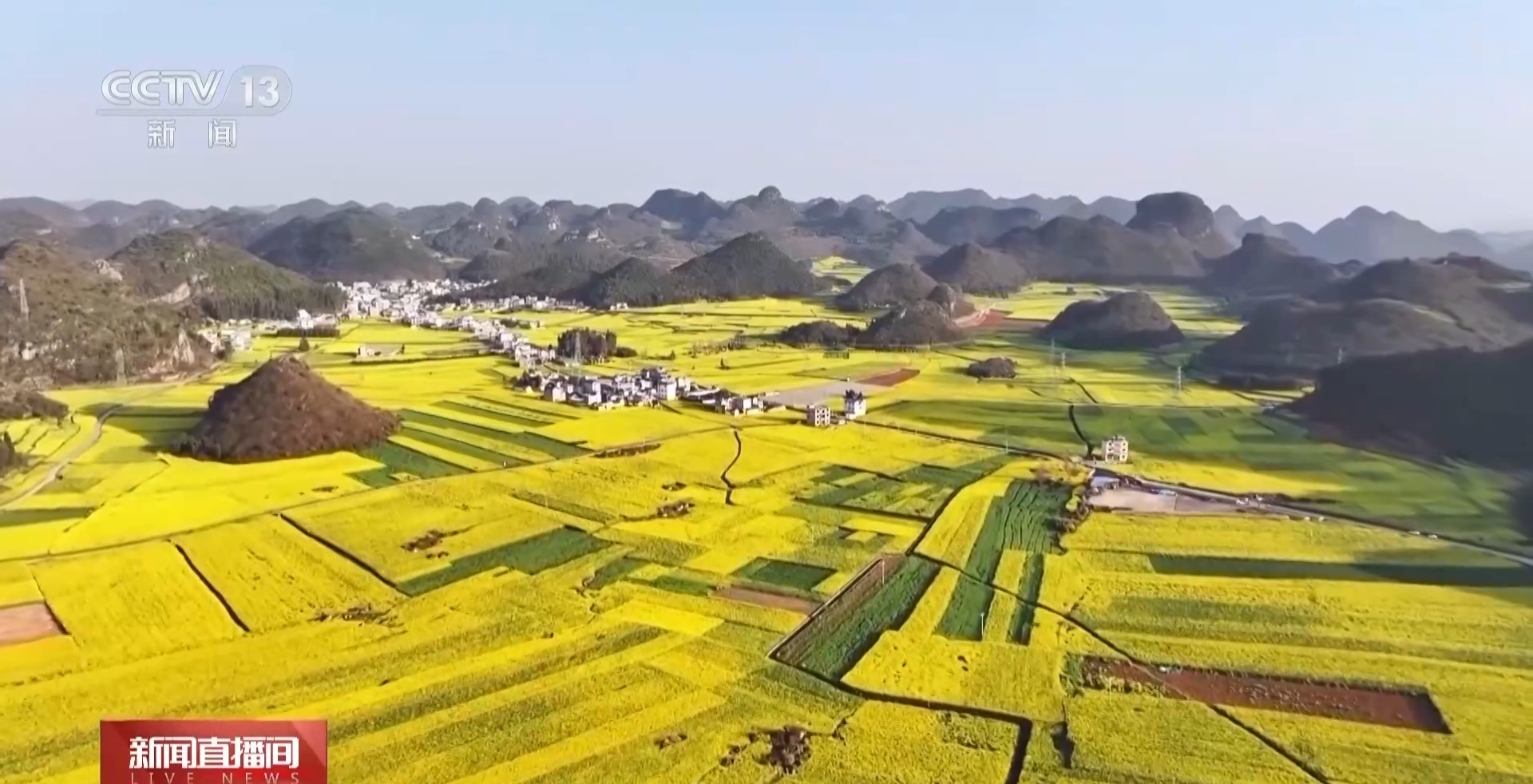 在云南曲靖市罗平县,百万亩油菜花进入最佳观赏期,金灿灿的花海缀满乡野,八方游客纷至沓来,当地也推出了一系列赏花新玩法。