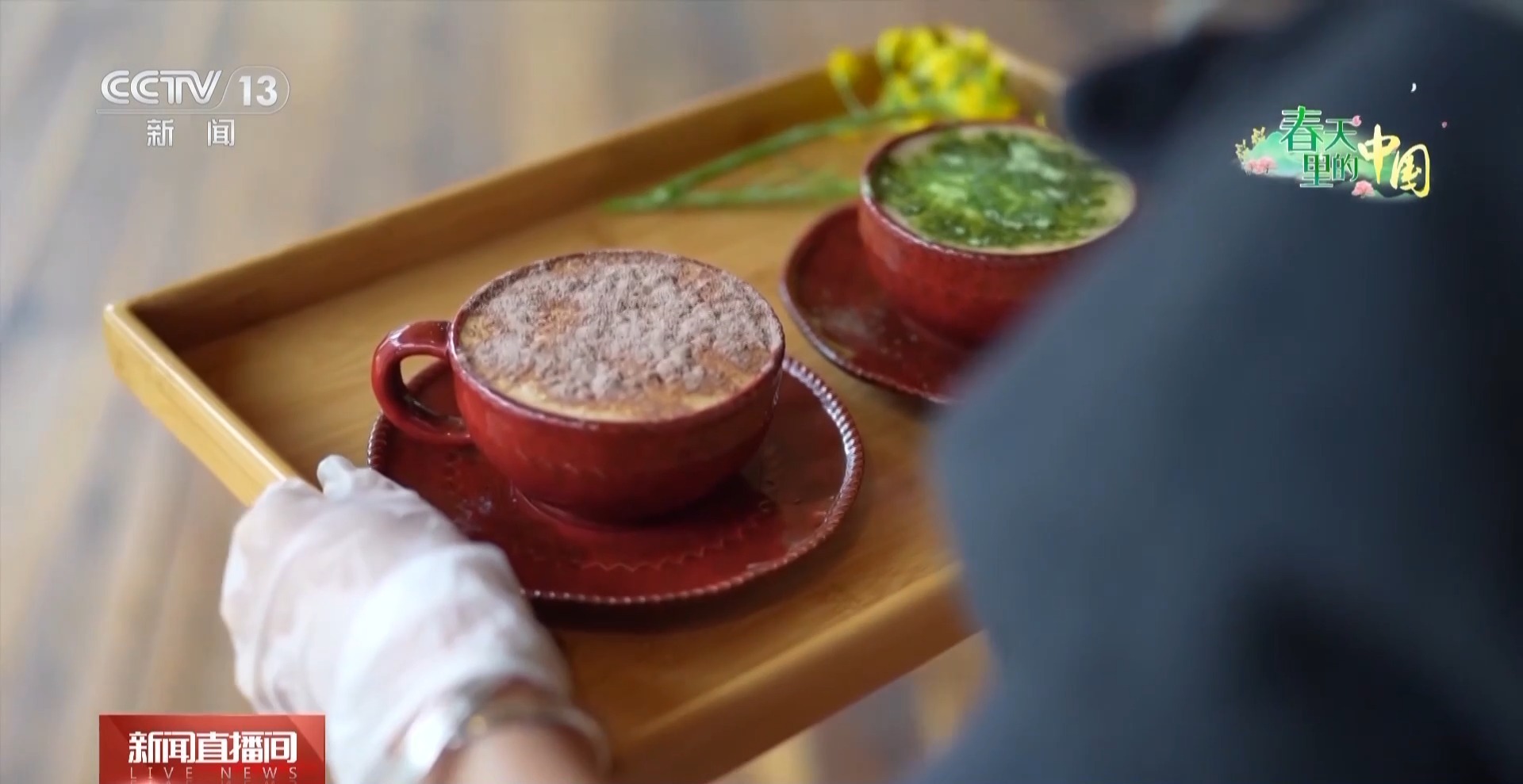 在瀑布边还可以点上一杯云南的小粒咖啡,搭配油菜花特色甜品,一边欣赏美景,一边享受美食。而当地的餐厅,用油菜花做的美食就更多了,凉拌的、清炒的,还有用油菜花做的小饼、用油菜花蜜做的饮品,满满一桌油菜花宴。