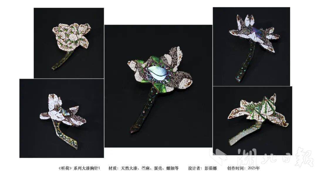 走进彭茹娜的创作世界,传统大漆工艺与现代审美碰撞出别样火花。2025年创作的《听荷》系列大漆胸针,融合传统工笔花鸟画的东方意境,以天然大漆为基底,搭配苎麻、蛋壳、螺钿、欧泊等多元材质,或勾勒荷韵清雅,或点缀珠光灵动,三件作品各有韵味,将中式美学藏于方寸之间。