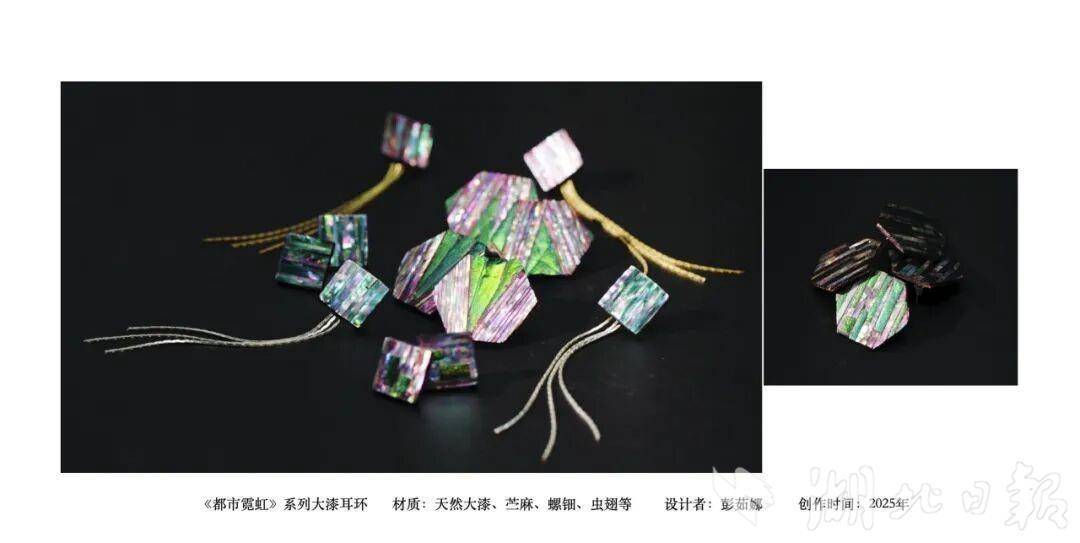 另一系列《都市霓虹》大漆耳环,则以抽象几何造型与灵动色彩节奏为设计核心,甄选天然大漆、苎麻、螺钿甚至虫翅等材料,让传统大漆工艺与当代都市生活相融,实现了非遗技艺的当代表达。