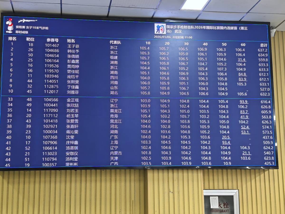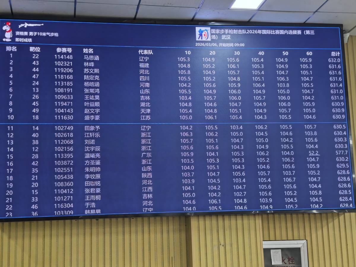 湖北日报讯(记者童军鹏、何煦)3月6日,来自全国的神枪手齐聚湖北省体育局射击运动管理中心射击馆,参加国家步手枪射击队2026年国际比赛国内选拔赛第三场比赛,包括盛李豪、黄雨婷、谢瑜等奥运冠军在内的众多选手展开激烈争夺。