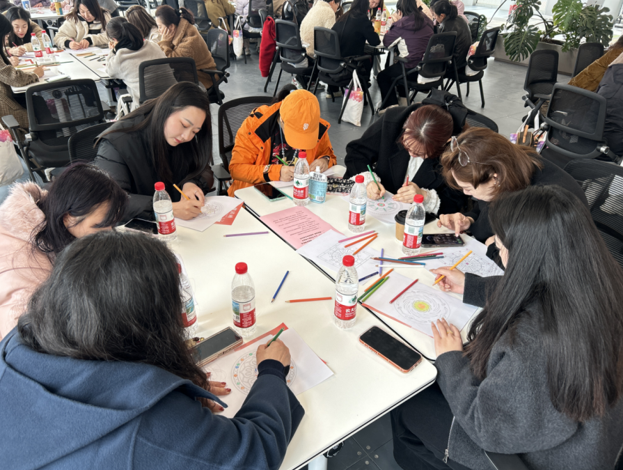 随即大家在武昌区妇联“四叶草”婚姻家庭辅导项目曹茜老师带领下,以曼陀罗绘画为核心形式,开展针对性心理团辅,引导女性释放创业压力、家庭压力,学习情绪管理技巧,提升自我认知,同时搭建女性交流平台,促进OPC社区与街道辖区女性间的联结,学习着如何更好地爱自己、爱家人,提升建设幸福家庭的内在力量。