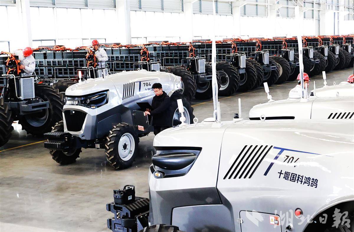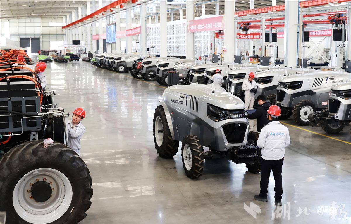 3月5日,在十堰郧阳区的十堰国科鸿鹄科技有限公司智慧农机生产线上,工人正在加紧组装智慧农机。