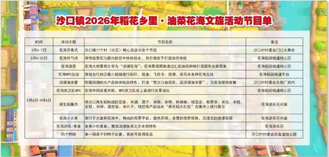 “本次文旅活动依托沙口再生稻产业,盘活冬季闲田打造油菜花海景观,打造九大主题亮点,既让游客领略洪湖本土的自然与人文之美,更以农文旅融合为抓手,打造‘春赏花、夏插稻、秋收割、冬捕鱼’四季体验模式,推动农业变景观、田园变乐园,助力‘再生稻特色镇’建设,让乡村美景成为乡村振兴的新动能。”沙口镇党委宣传委员黄霆婷介绍道。