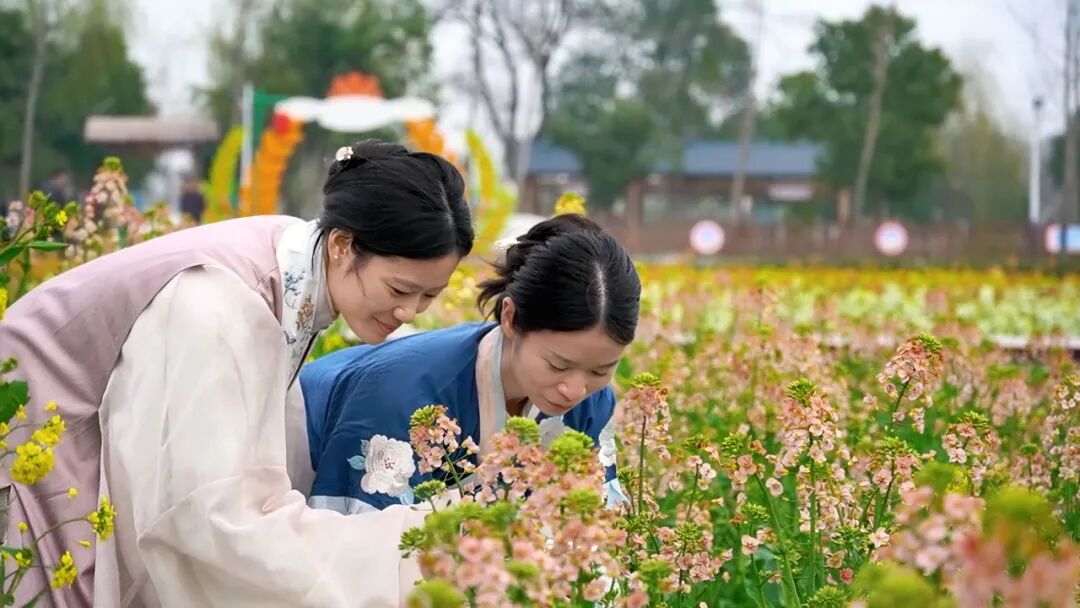 身穿汉服的游客在花海打卡。