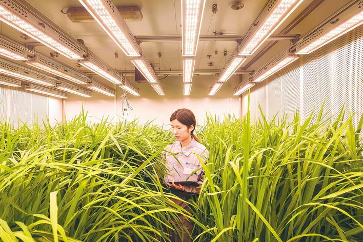 在武汉国家农创中心核心功能区的中国种子生命科学技术中心,温室科学家姬晨晨在室内培养室内观察水稻秧苗生长情况。(湖北日报全媒记者 任勇 通讯员 张琼 兰娅芳 摄)