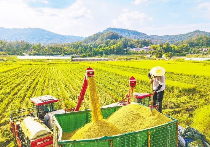 在黄冈市罗田县大河岸镇磙石坳村高标农田,收割机正在收割中稻。 (视界网 王江 摄)