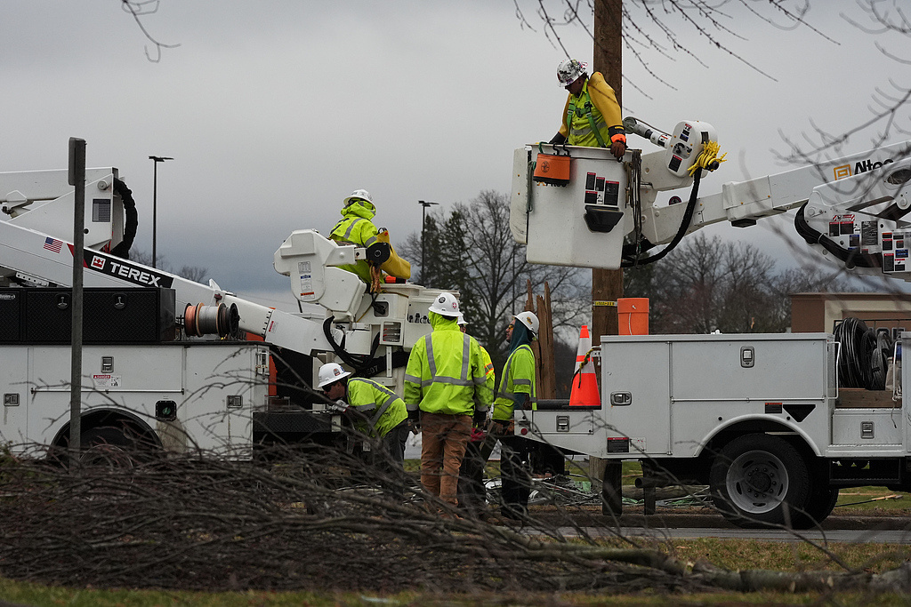 △当地时间3月7日,美国密歇根州,电力工人强风暴过后开展作业。
