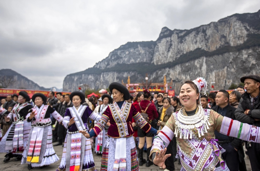 黔西市化屋村村民为游客表演苗家歌舞。翟培声 摄