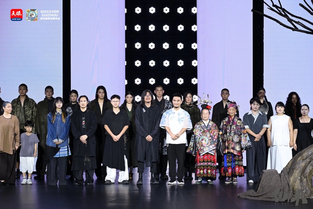 贵州“村T”80岁“姐妹花”潘玉珍(前排右四)、李儒芬(前排右五)登上中国国际时装周。