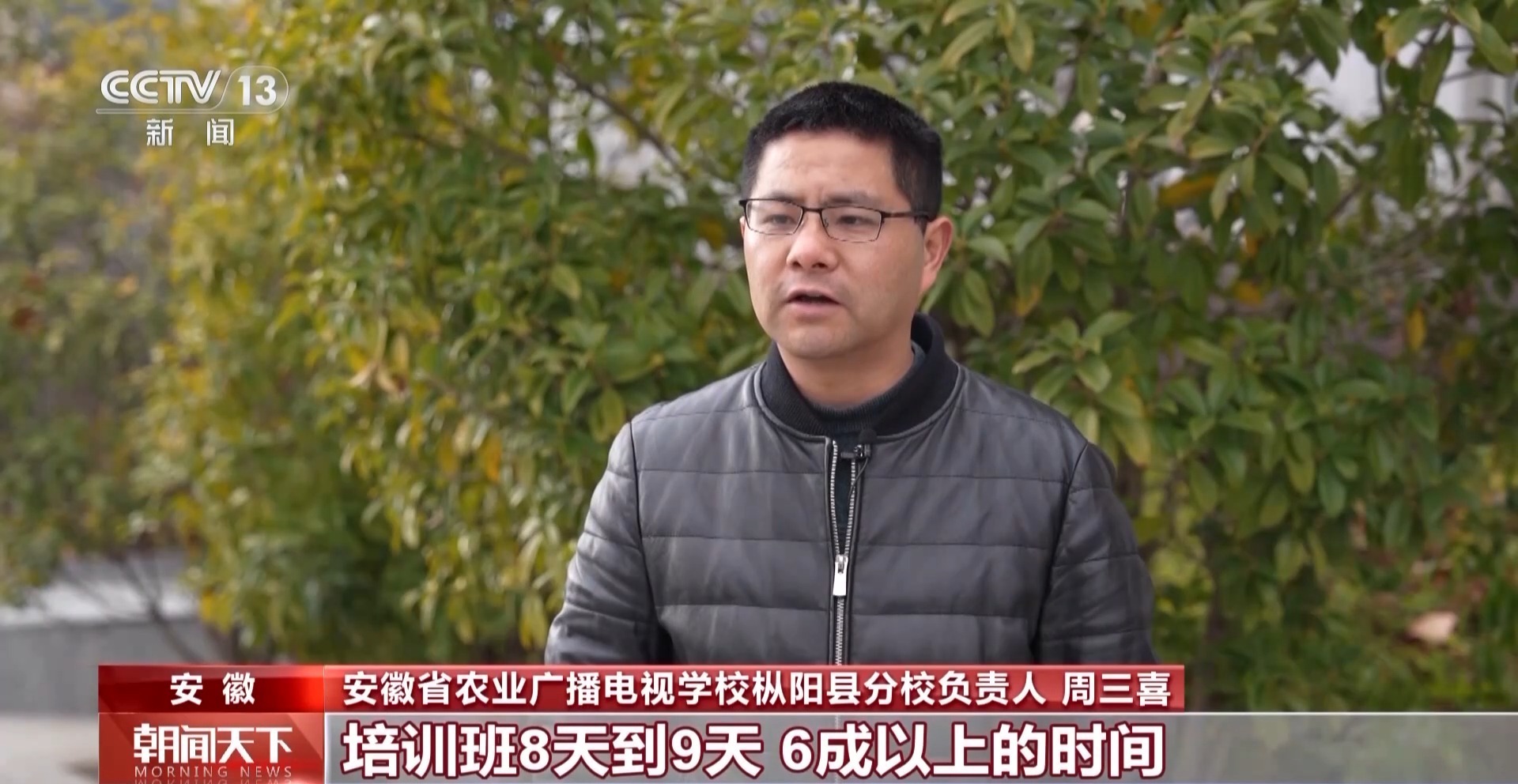 安徽省农业广播电视学校枞阳县分校负责人 周三喜:培训班8到9天,六成以上时间都在田间地头实践、实训,让技能培训从课堂走向田间。