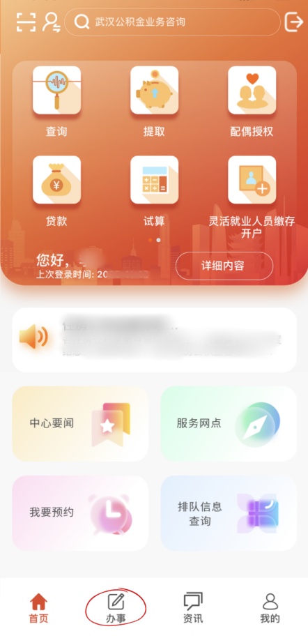 01 打开并登录武汉住房公积金APP,点击“办事”,选择“信用管理-信用等级查询”;