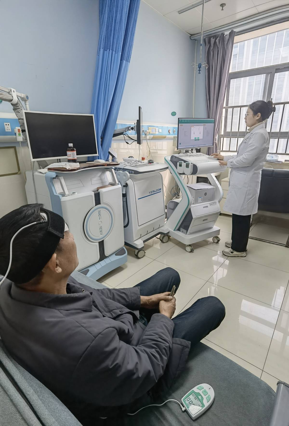 在治疗现场记者看到,顾先生前额一侧由绑带固定有块电刺激贴片,一个手机大小的调控器通过电线与贴片连接,旁边体积更大的经颅电磁刺激治疗仪主机上可查看治疗者各项参数。“单次治疗约40分钟,每20分钟休息一会儿。感觉麻麻的,其他没有任何不适。”顾先生说。