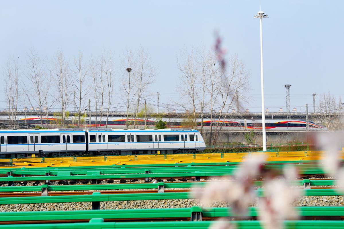 出库前往正线的地铁1号线列车穿梭粉白花瓣。