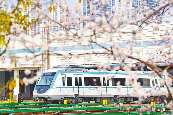 春暖花开,樱韵渐浓。3月9日,武汉地铁1号线古田车辆段内,早樱悄然绽放。出库前往正线的地铁列车从开满粉白花朵的樱花树旁穿梭而出,如同一幅流动画卷。据介绍,自3月10日起,武汉地铁特别推出赏花季旅游一日票,以方便市民游客出行。(湖北日报通讯员 李丹 产启斗 摄)