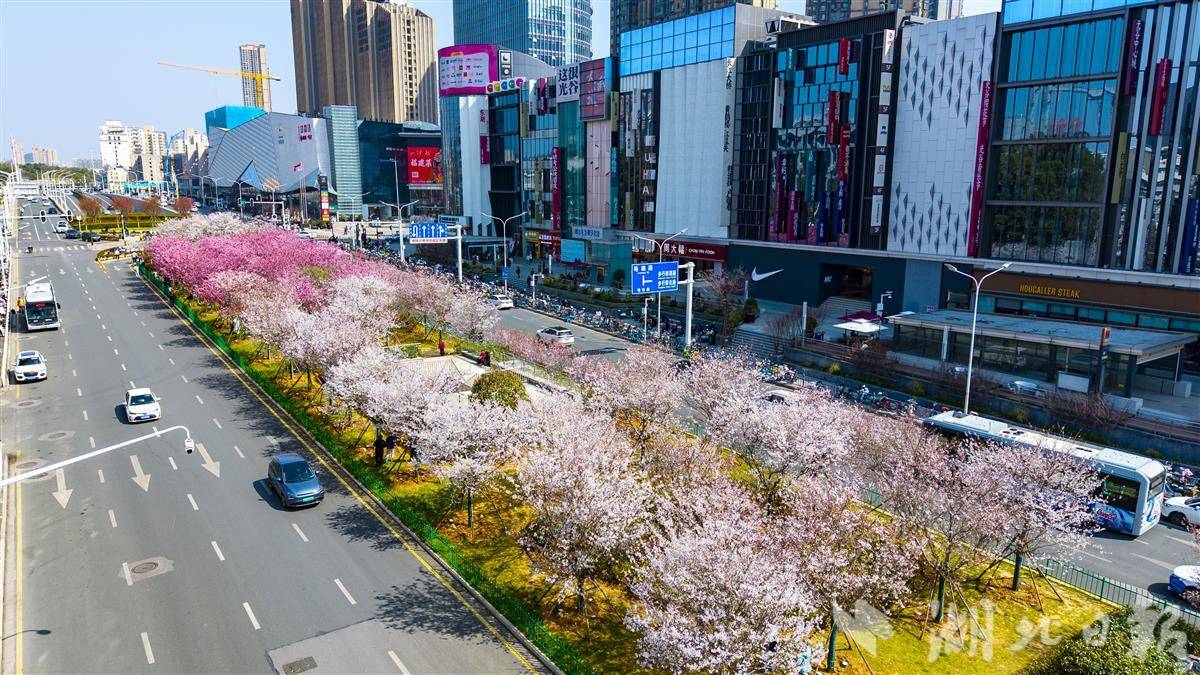 光谷珞喻路景观廊化身一片浪漫花海,廊上樱花正值盛花期。
