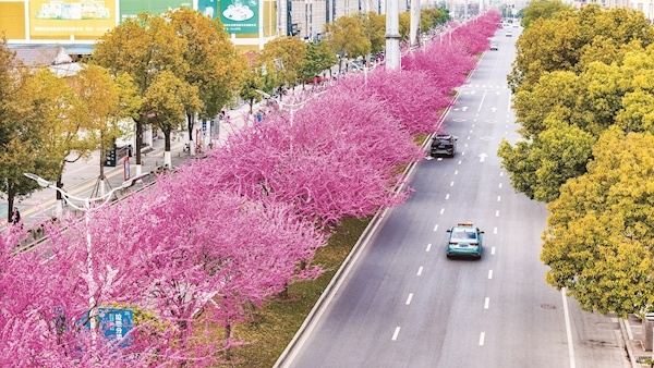 近日,随着气温回升,春花陆续绽放。早樱、紫荆、樱桃,你不让我,我不让你,都开满了花赶趟儿,红的像火,粉的像霞,白的像雪……处处繁花扮靓城乡道路与长江两岸,荆楚大地春景迷人。