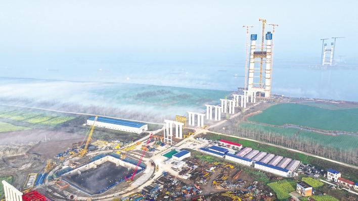 大桥主塔节节攀升,预计今年上半年封顶,届时将比221米的“亚洲桅杆”龟山电视塔还要高出一大截。