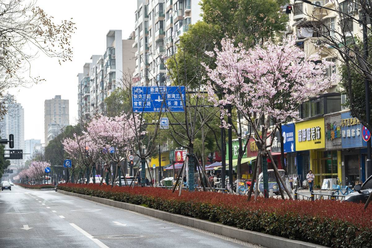 湖北日报讯(记者张竞恒、通讯员李军、申燕伟)三月的武汉,春意刚刚冒头。3月10日,阳光正好,武汉市江汉区常青五路长港路地铁F出口外,已是满树烟粉。风从常青五路那头吹过来,路中央绿化隔离带里的40株早樱同时轻轻晃动。花瓣薄得透光,密密匝匝缀满枝头。风再大些的时候,便有花瓣簌簌落下,在空中打了个旋儿,轻轻落在过往车辆的车顶。