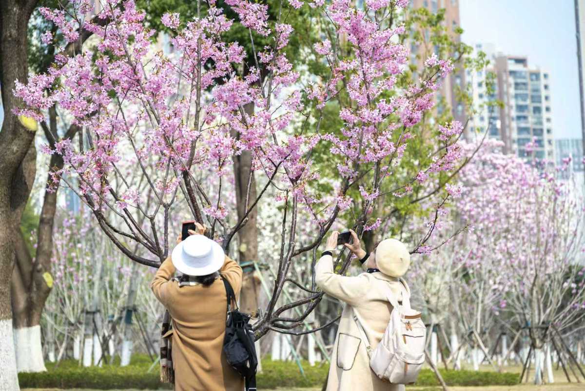 根据江汉区最新统计,全区综合公园、口袋公园及道路隙地共栽植樱花超过2000株。西北湖绿化广场的480余株染井吉野、大岛樱即将接力盛放;王家墩公园290株樱花沿醉花谷铺展;常青公园274株多品种樱花静候游人;高架桥下、街角路口,也藏着星星点点的惊喜——宝丰北路高架下347株樱花绵延铺开,还有红旗渠路游园那一株独自盛开的吉野樱静静守候……春意,正在整座城市里悄悄流动。江汉区城管执法局园林绿化科工作人员表示,预计3月下旬,该区樱花将进入盛花期。其间,西北湖、王家墩、后襄河等公园还将承办“花韵春光 江汉揽胜”江汉2026年赏樱季各项活动,为市民提供精彩的赏樱体验。
