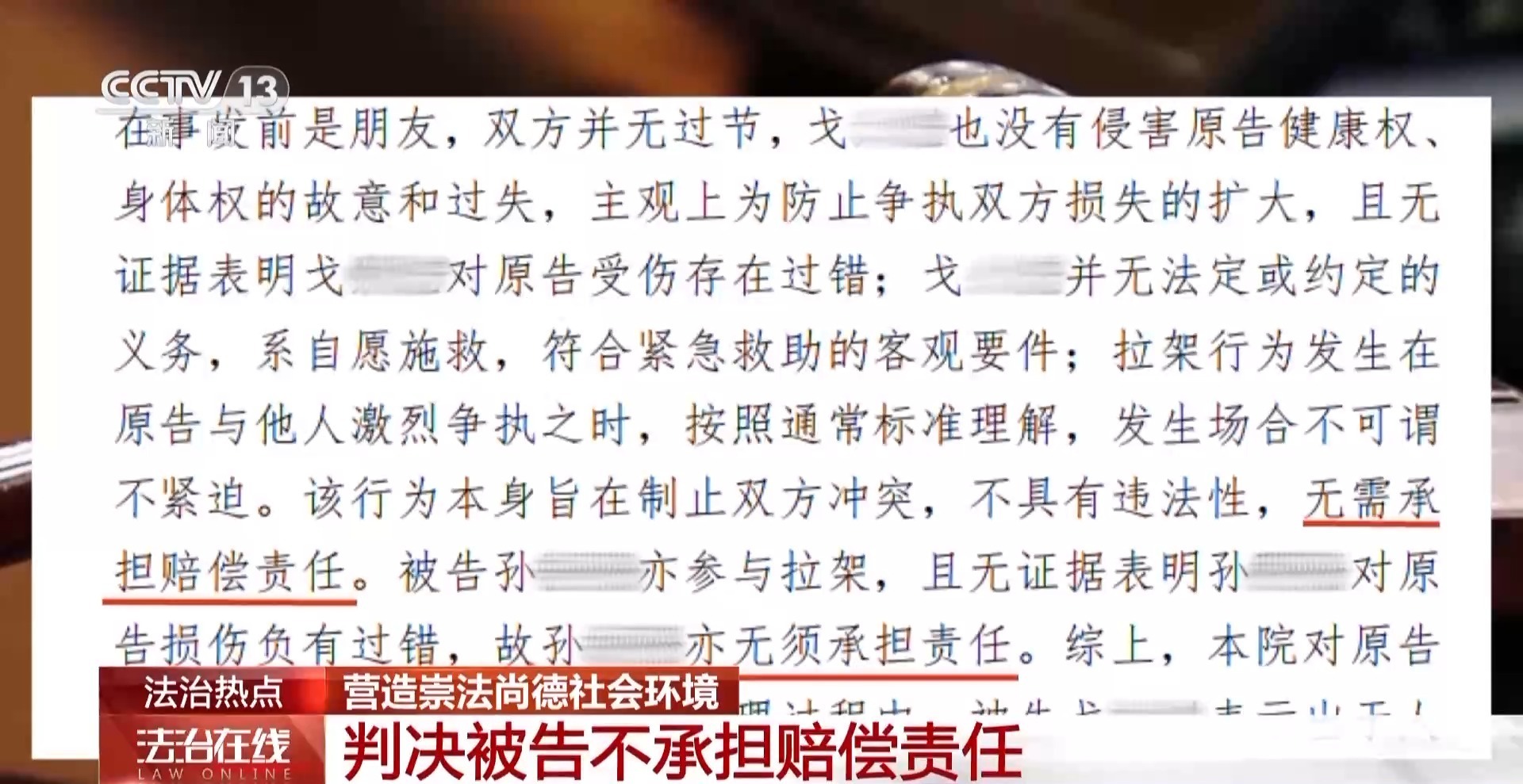 上海市宝山区人民法院月浦人民法庭法官 李鹏翔:我们最终认定戈先生的行为是拉架行为。在排除了故意伤害的可能性之外,我们认定它就是一种民法典规定的紧急救助行为,所以这种情况是应当免予承担民事责任的。