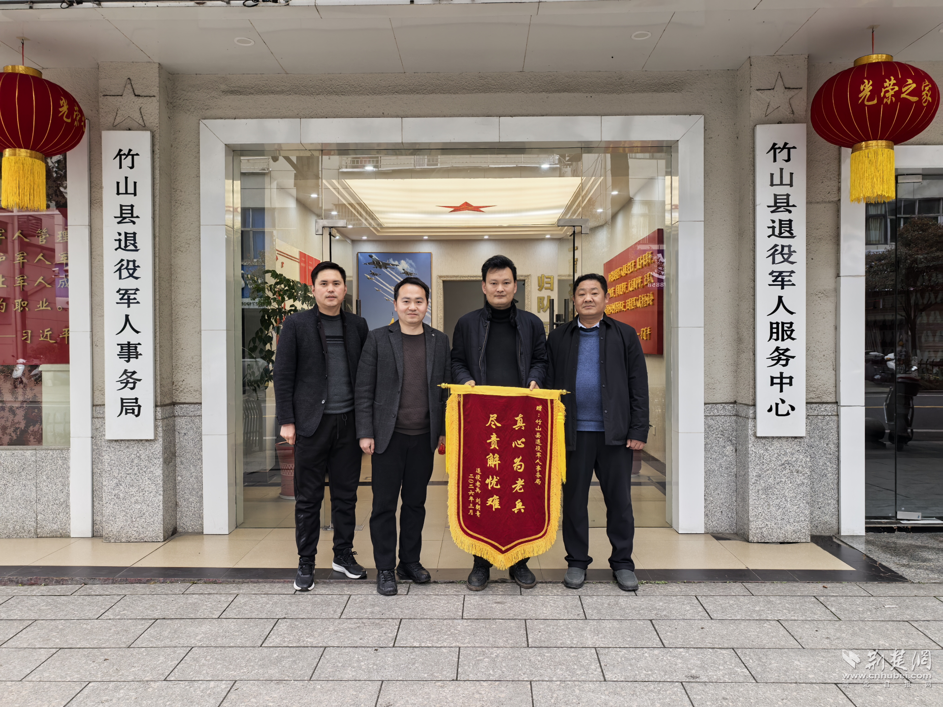 荆楚网(湖北日报网)讯(通讯员曾章题、胡丰、郑志意)3月9日清晨,竹山县退役军人事务局服务大厅内,退役军人刘朝青双手紧攥锦旗,步履匆匆地走向思政股负责人郑志意。锦旗上,“真心为老兵 尽责解忧难”十个烫金大字熠熠生辉。这位41岁的汉子喉头哽咽:“郑股长,感谢组织!年前我娘做手术花了七八万,家里塌了天……”郑志意快步上前,紧紧握住他的手:“退役军人为国奉献,组织就是你们的后盾!”