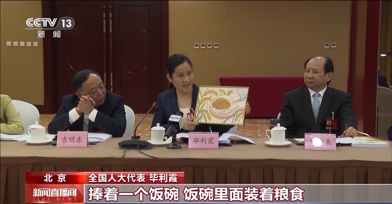 全国人大代表 毕利霞:我深知“好土好水才能产好粮”,不仅要守住耕地红线, 更要守好生态底线。湖北是粮仓,我是粮农,所以带来了一幅湖北非遗手工汉绣作品。作品中展示了一双勤劳粗糙的双手捧着一个饭碗,饭碗里装着粮食。我们不仅要把环境、生态保护好,还会把饭碗端得更稳更牢。
