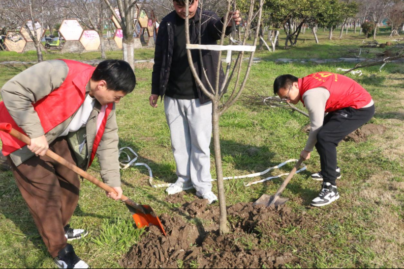 参加植树的志愿者三五人一组,分工协作,配合默契。大家干劲十足,将刚刚运到的樱花树苗小心放入坑中,拆除树苗根部的布条,确保根系能够自由舒展。随后,有的挥锹铲土,有的填土,有的浇水……每一道工序都做得一丝不苟,现场不时传来劳动的欢声笑语。