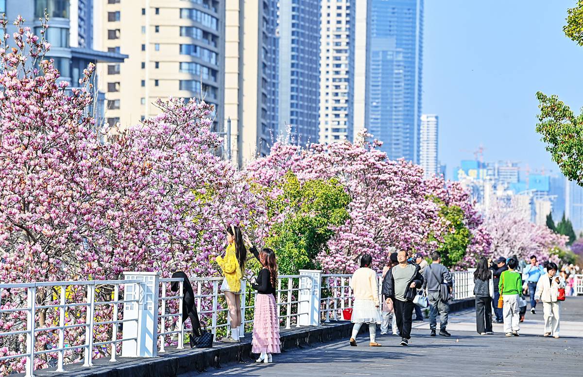 花白如玉,吐气如兰,梅花之后,玉兰悄然登场。3月11日,武汉汉口江滩公园的玉兰花枝摇曳,春意盎然。市民们纷纷走出家门,在玉兰树下打卡拍照,感受这美好春光。
