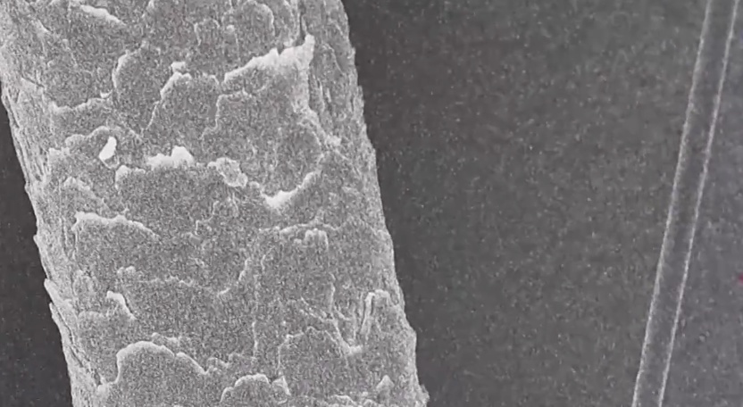 通过电子显微镜放大800倍,对比头发丝和T1200级碳纤维,头发丝表面布满鳞片,直径约67微米,而T1200级碳纤维丝直径还不到4.5微米。