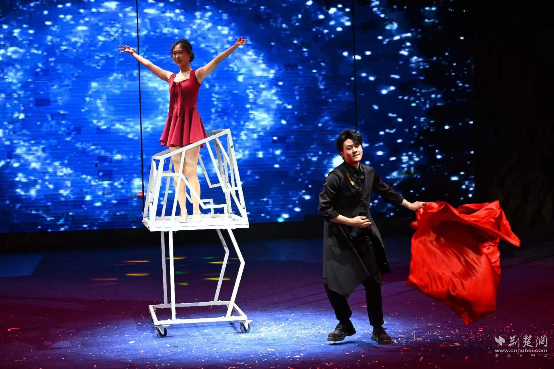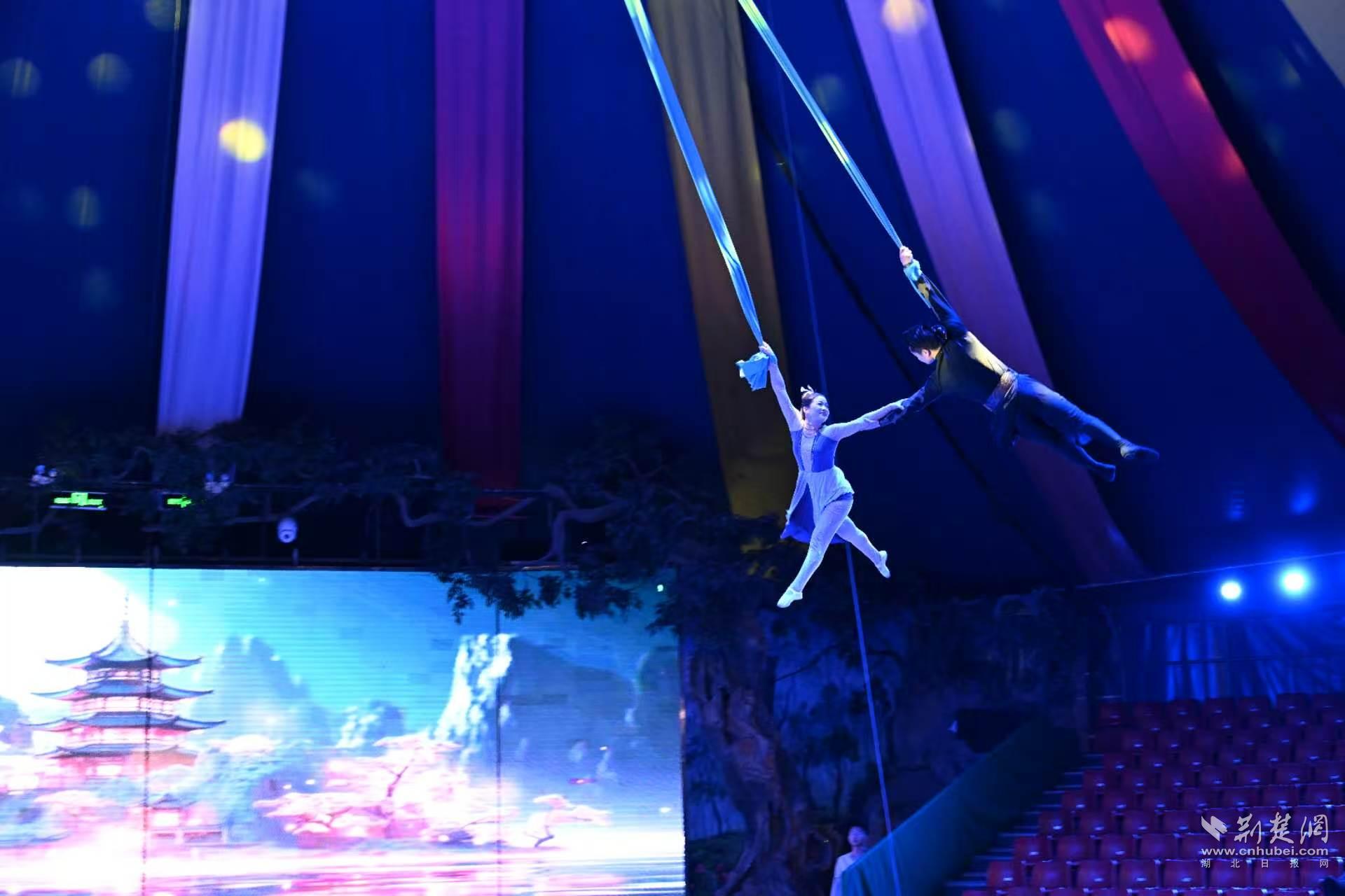 从今年开始,省杂技家协会“两新工作专委会”将陆续推荐国内优秀杂技演员在东湖大马戏剧场演出,所有演职人员均为新文艺群体。新编排的双人绸吊节目《珞樱云绸》,伴随着经典旋律《神话》缓缓响起,两位演员借助两条绸缎在空中盘旋、缠绕、升腾。节目的舞台背景,正是东湖盛放的樱花海,粉色花瓣与演员飘逸的身姿交相辉映,仿佛仙境眷侣在云端诉说旷世之恋。曾参加过《中国达人秀》的冠军选手金太明此次带来绝活——悬步钢丝。在脚下仅有的一根细细绳索上,他展示了包括一字马、倒立、翻跟头等融合体操技巧与高空平衡的绝技。更令人惊叹的是,他还肩挑两人在钢丝上行走,每一步都牵动着观众的神经。杂技演员郭世航带来的高台晃管同样扣人心弦,演员在堆叠晃动的圆管上保持平衡,甚至表演跳绳等高难度动作,引得现场阵阵惊呼。东湖大马戏的保留节目《极速飞轮》,巨大的滚轮在空中飞速翻转,演员不系任何安全绳,在滚轮外侧如履平地,甚至跳绳、蒙眼奔跑,每一步跳跃都让全场倒吸一口凉气,堪称“用生命在表演”的真实写照。