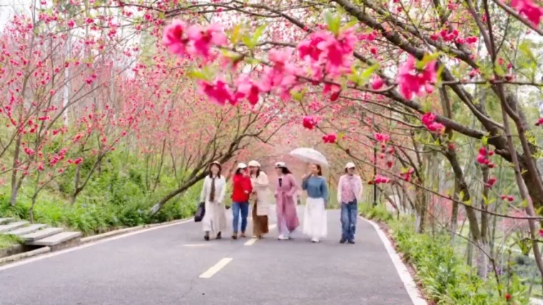 在花乡茶谷景区,6万余株贵妃南极红竞相绽放,连片花海如红云缭绕山谷,与碧绿茶园、青山绿水构成一幅秀美的春日画卷。