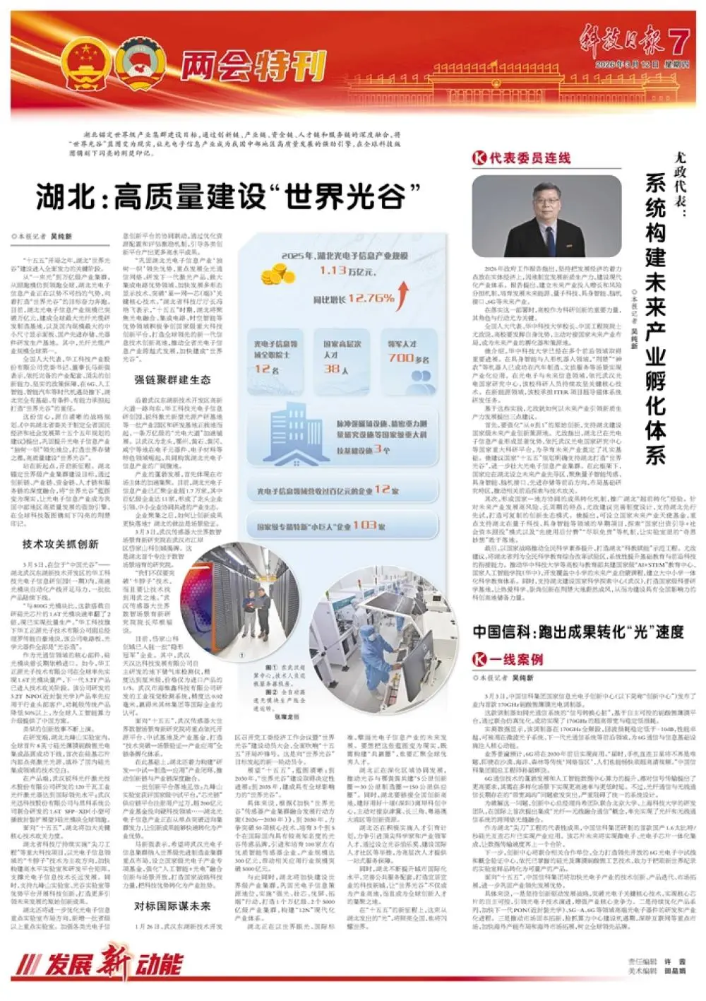 2026年3月12日,《科技日报》刊发整版报道《湖北:高质量建设“世界光谷”》,聚焦湖北技术攻关抓创新,强链聚群建生态,对标国际谋未来,让光电子信息产业成为我国中部地区高质量发展的强劲引擎,将“世界光谷”蓝图变为现实。以下是全文。