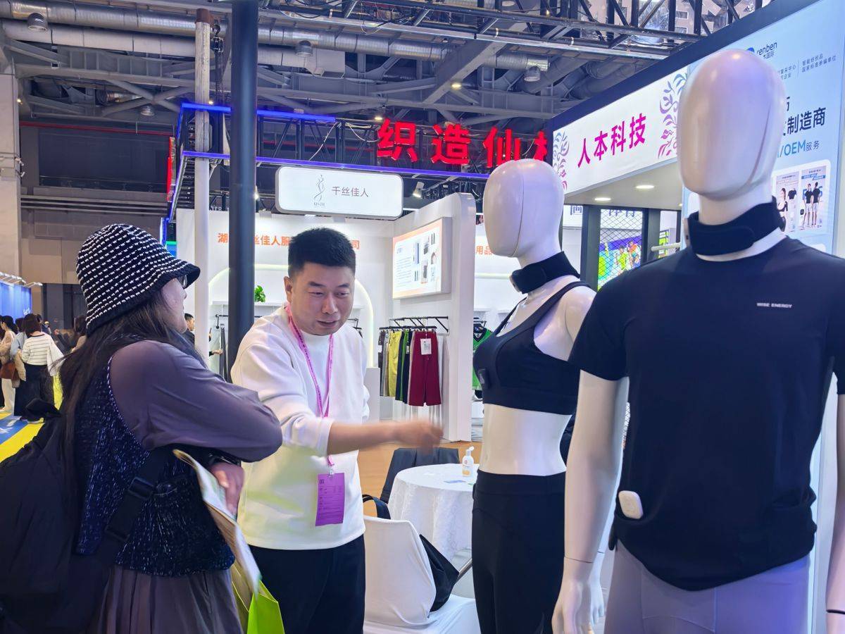 “比如这个颈带,有利于肩颈按摩,睡眠不好的人群,居家办公、出差旅行都可以使用。”人本国际市场总监张勇拿起一款产品现场演示。展台上,智能按摩袜子、美背胸托、心电监测仪、智能运动燃脂塑形衣等一字排开。这些看似普通的服饰,每一件都藏着“黑科技”:传感器实时监测身体数据,AI算法分析健康状况,智能模块提供按摩理疗。