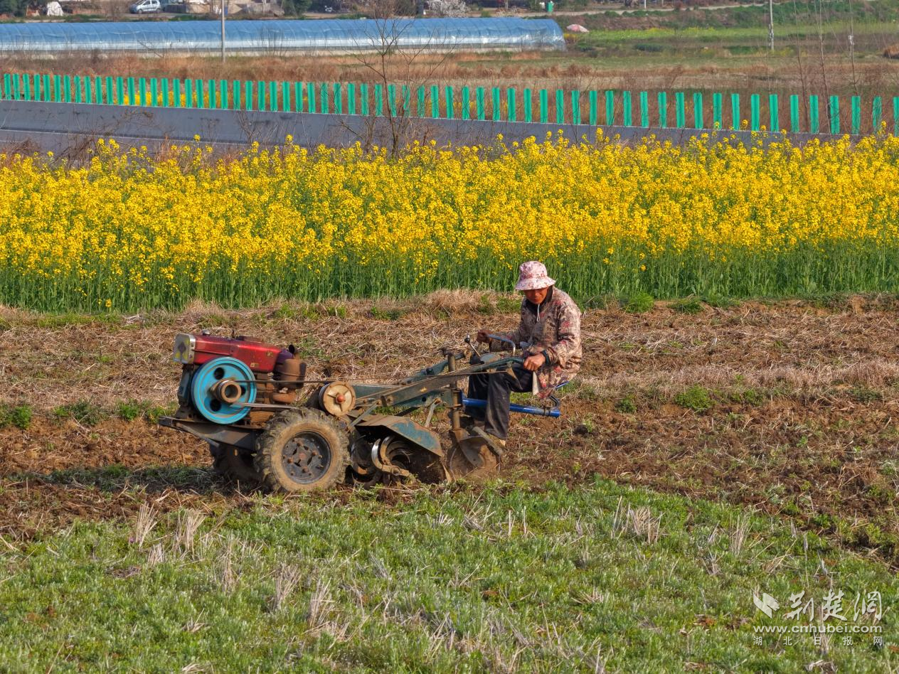 3月12日,在京山市新市街道鄢河村一组,村民孙国华正驾驶着旋耕机在田间穿梭,趁着晴好天气翻耕晒土,为即将开始的西瓜种植做足准备。
