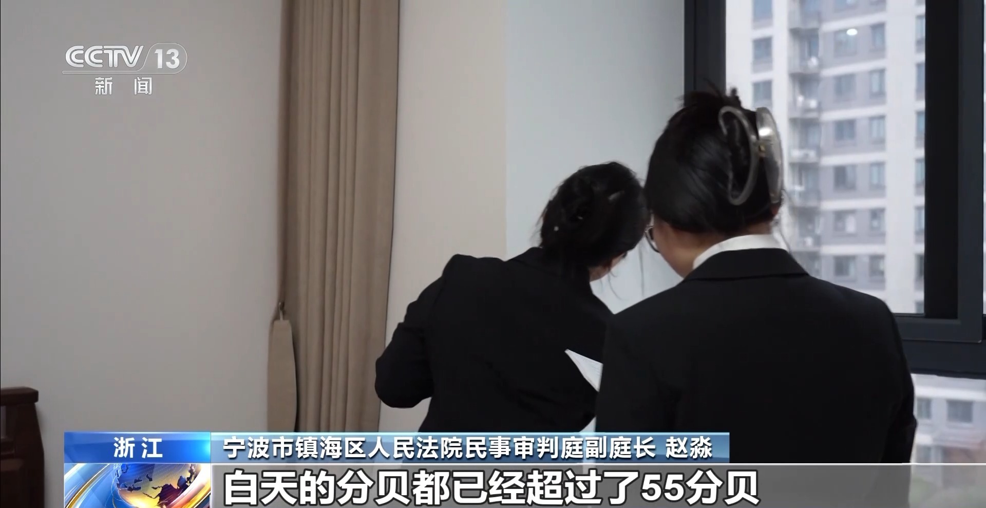 宁波市镇海区人民法院民事审判庭副庭长 赵淼:经过现场实地测量,双方都找来了一些测量分贝的仪器,测下来之后,白天的分贝都已经超过55分贝。我们有一个社会生活环境噪声管理标准,标准规定居民区的噪声白天不能超过55分贝,晚上不能超过45分贝。而且空调外机装的位置,是紧挨着原告的次卧的外墙,距离他的窗户不到半米。