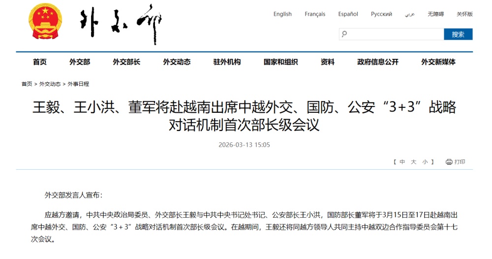 应越方邀请,中共中央政治局委员、外交部长王毅与中共中央书记处书记、公安部长王小洪,国防部长董军将于3月15日至17日赴越南出席中越外交、国防、公安“3+3”战略对话机制首次部长级会议。在越期间,王毅还将同越方领导人共同主持中越双边合作指导委员会第十七次会议。