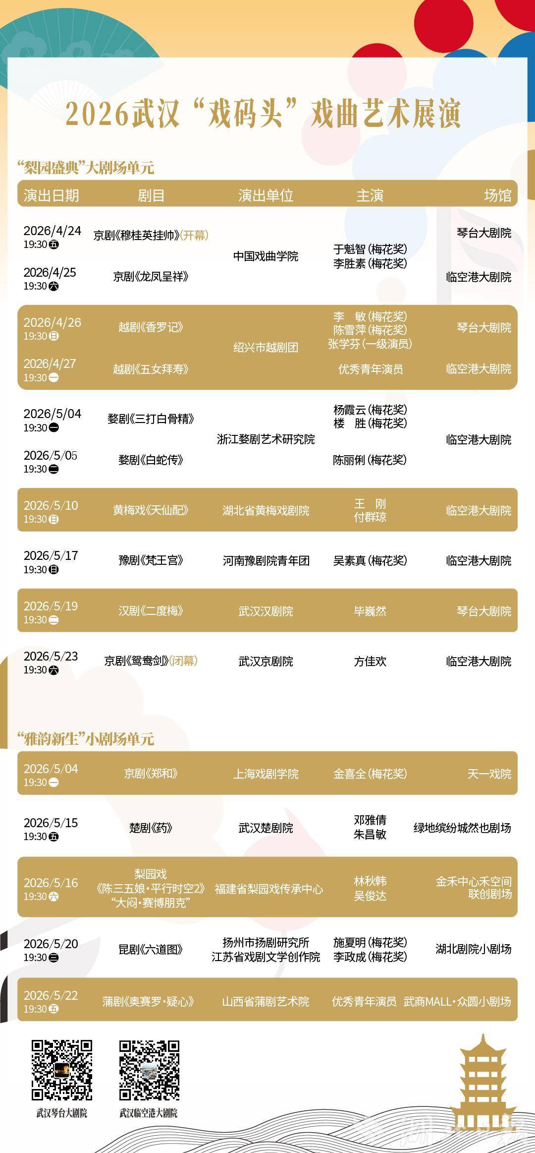 湖北日报讯(记者农新瑜、通讯员周媛媛)4月24日至5月23日,由武汉市人民政府主办,中共武汉市委宣传部、武汉市文化和旅游局承办,武汉琴台大剧院、临空港大剧院、武汉楚剧院等单位具体执行的2026武汉“戏码头”戏曲艺术展演,将在武汉举办。