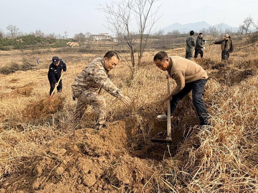 活动现场,大家有序领取工具与树苗,迅速投入到义务植树中。三五人自成一组,分工协作、默契配合——挥锹挖坑、扶苗培土、提水浇灌,每个环节都一丝不苟。经过一上午的辛勤劳作,千余株侧柏、湿地松、红梅等优质苗木在春风中昂然挺立,原本空旷的山边披上新装,一幅“水清岸绿、村美人和”的生态画卷正徐徐展开。