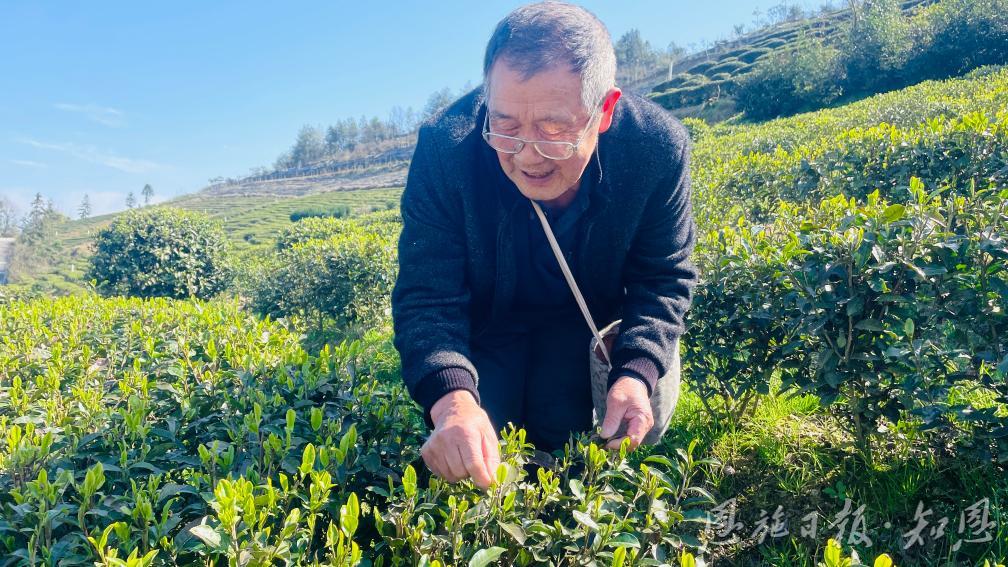 茶农谢正普年过七旬,但采茶依然灵活。 (全媒体记者 杨亚玲 摄)
