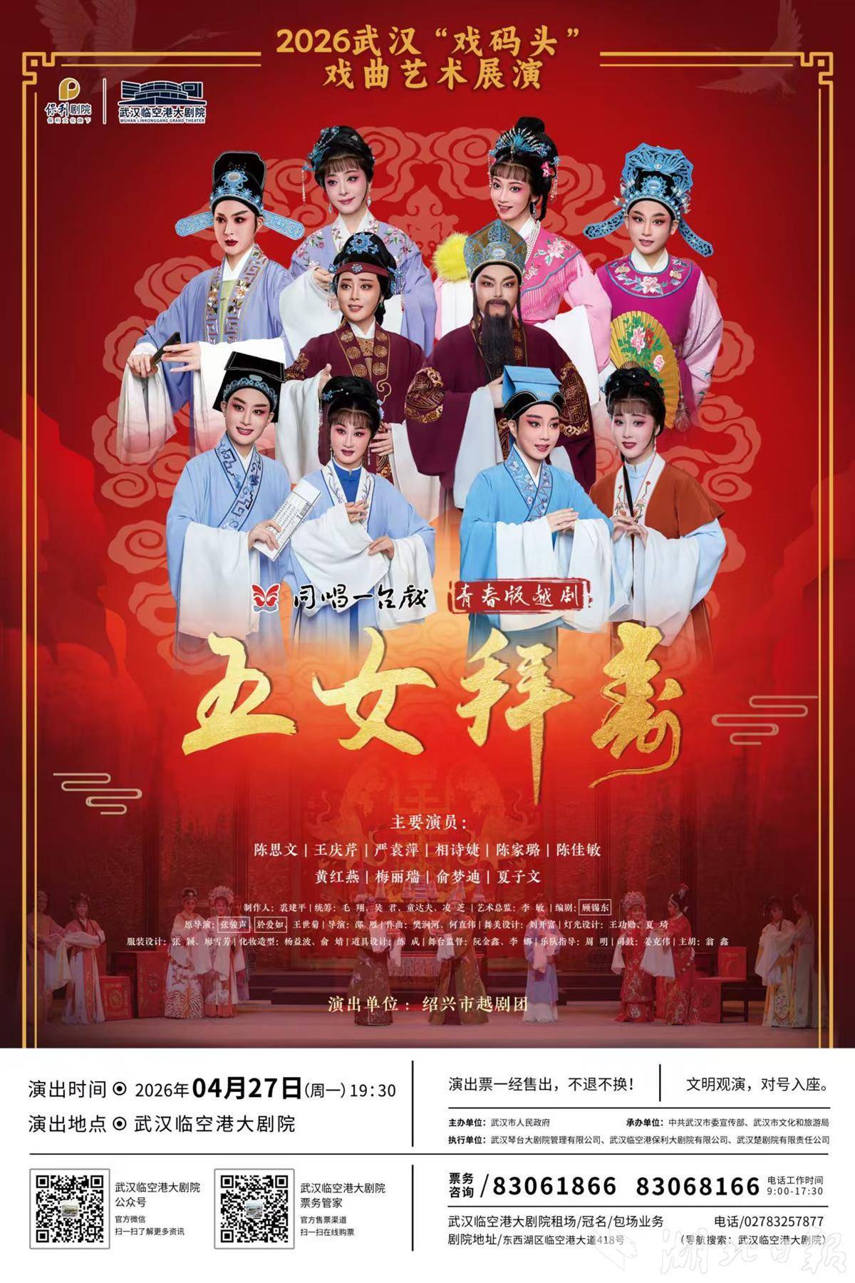 在戏曲板块,剧院推出2026武汉“戏码头”戏曲展演系列,涵盖京剧、越剧、婺剧、黄梅戏、豫剧等多个剧种。从4月京剧《龙凤呈祥》拉开序幕,到5月京剧《鸳鸯剑》圆满落幕,《五女拜寿》《三打白骨精》《白蛇传》《天仙配》《梵王宫》等经典剧目将依次上演。