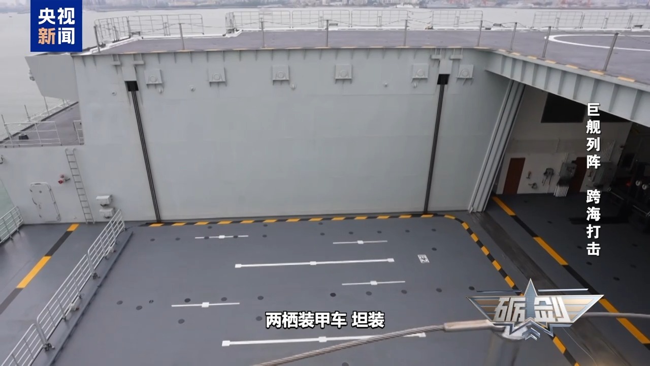 在机库下方是车辆库和坞舱,主要用来存放气垫艇、两栖装甲车、坦装以及自行榴弹炮。