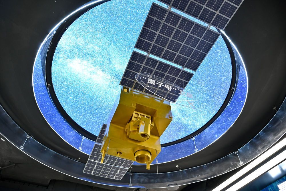 在位于安徽省合肥市的中电信量子信息科技集团有限公司科技体验馆内拍摄的“墨子号”量子卫星模型(2025年7月1日摄)。新华社记者 张铖 摄